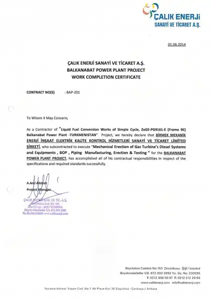 Proje Adı : Balkanabat 254 MW Enerji Santrali Akaryakıt Dönüşüm Projesi